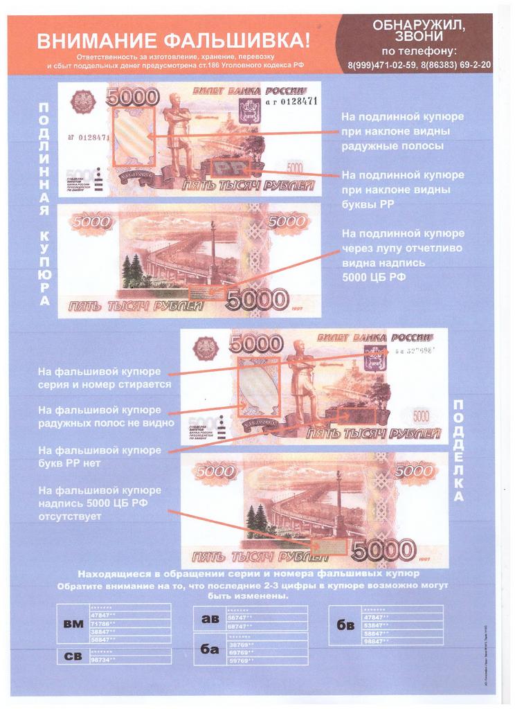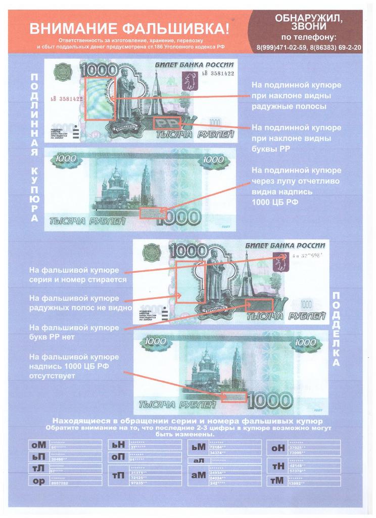 В связи с имеющимися фактами сбыта на территории города и района поддельных денежных купюр обращаем Ваше внимание на правила определения подлинности денежных знаков, с которыми Вы можете ознакомиться на плакатах, размещенных на информационных стендах в торговых объектах г. Белая Калитва и Белокалитвинского района. В случае обнаружения Вами денежных купюр вызывающих сомнение в подлинности, просьба незамедлительно сообщить о произошедшем в полицию по телефону 8-999-471-02-59, 8-86383-69-2-20.