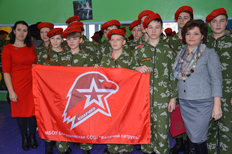 Начался Сбор с построения участников и сдачи рапорта командирами военно-патриотических клубов и объединений. Затем состоялась торжественная церемония вступления обучающихся Богураевской средней школы в ряды Белокалитвинского отделения Всероссийского военно-патриотического движения «Юнармия». В торжественной обстановке юнармейскому отряду «Казачий патруль» были вручены значки юнармейца, знамя «Юнармии».