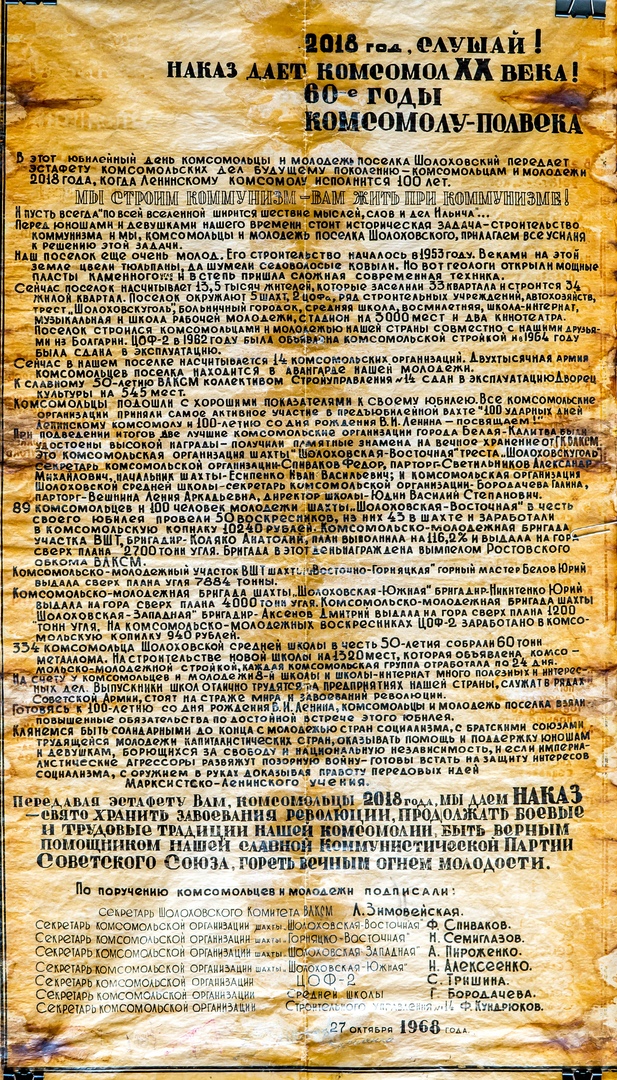 Капсула была торжественно вскрыта и все присутствующие узнали тайну послания, заложенного 50 лет назад. Инициатором составления письма потомкам была Любовь Зимовейская, которая возглавляла комсомольскую организацию Шолоховской горки. В молодом строящемся поселке было более 2 тысяч комсомольцев. Ребята написали письмо на пергаменте тушью, все секретари организаций школ, шахт, больницы поставили свои подписи. Капсулу, табличку и ящик для хранения заказали на Белокалитвинском металлургическом заводе. Все торжественно было упаковано в присутствии всех школьников, жителей поселка, лучших комсомольцев и упрятано в большую красную звезду из бетона.