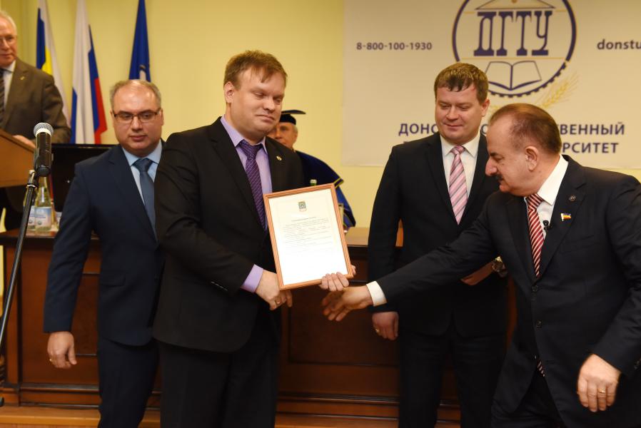 30 января в Конгресс-холле Донского государственного технического университета прошло заседание Ученого совета, на котором первый заместитель главы Администрации района Дмитрий Устименко вручил ректору опорного университета Бессариону Месхи благодарственное письмо от имени главы Администрации Белокалитвинского района Ольги Мельниковой.