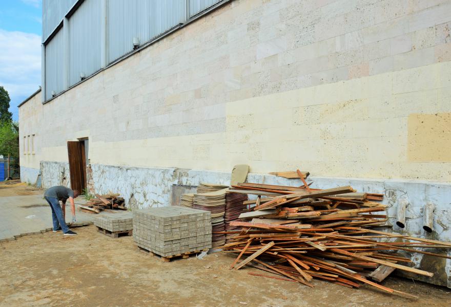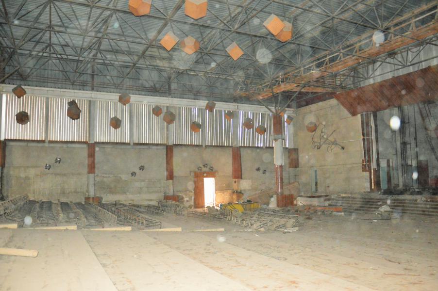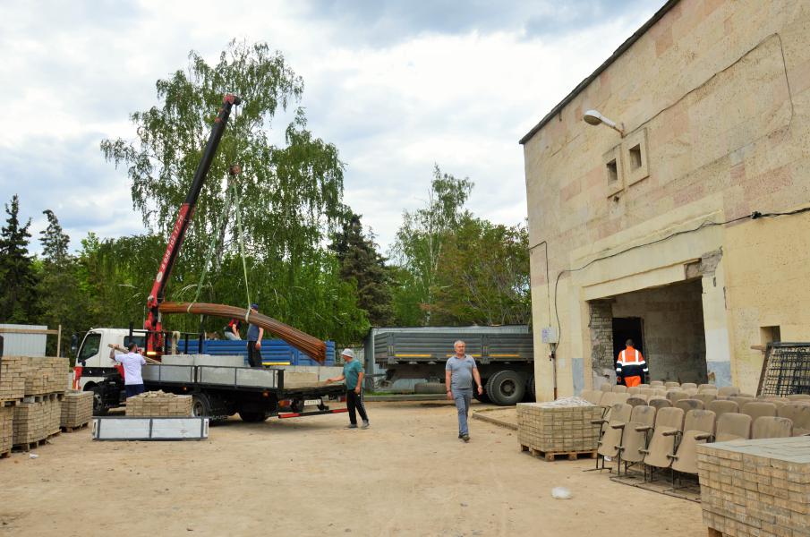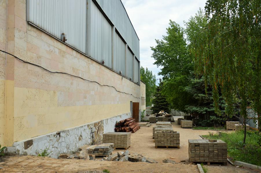 В настоящее время осуществляется демонтаж строительных конструкций внутри здания, металлоконструкций на внешнем периметре, тротуарной плитки. С целью сохранения зеленых насаждений молодые деревья с корневой системой были пересажены на территорию сквера им. Сафарова.