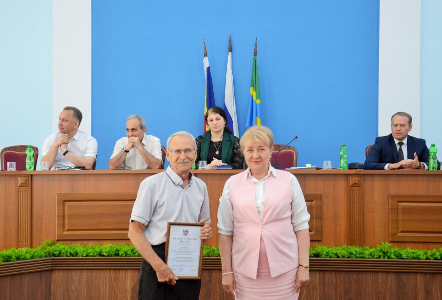 Руководителю народного хора «Аксинья» Евгению Даниловичу Хорунженко Ольга Мельникова вручила Благодарственное письмо Министерства культуры Ростовской области за многолетний и добросовестный труд, личный вклад в дело сохранения и приумножения самобытных культурных традиций Белокалитвинской земли и в связи с 75-летием со дня рождения