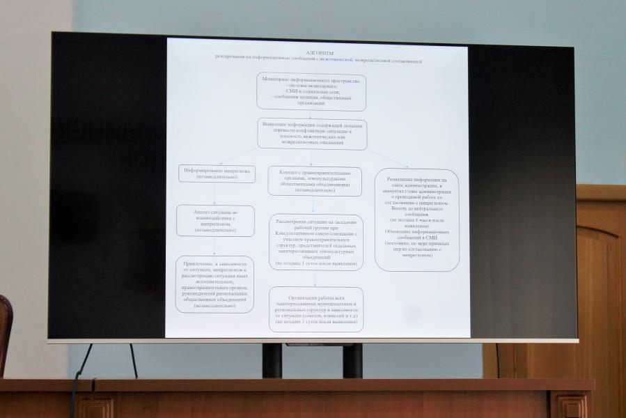 Собравшиеся подробно разобрали действия правоохранительных органов и органов муниципальной власти в случае обнаружения информации, содержащей попытки перевести конфликтную ситуацию в плоскость межэтнических или межрелигиозных отношений.
