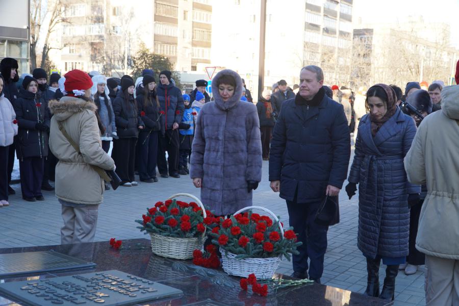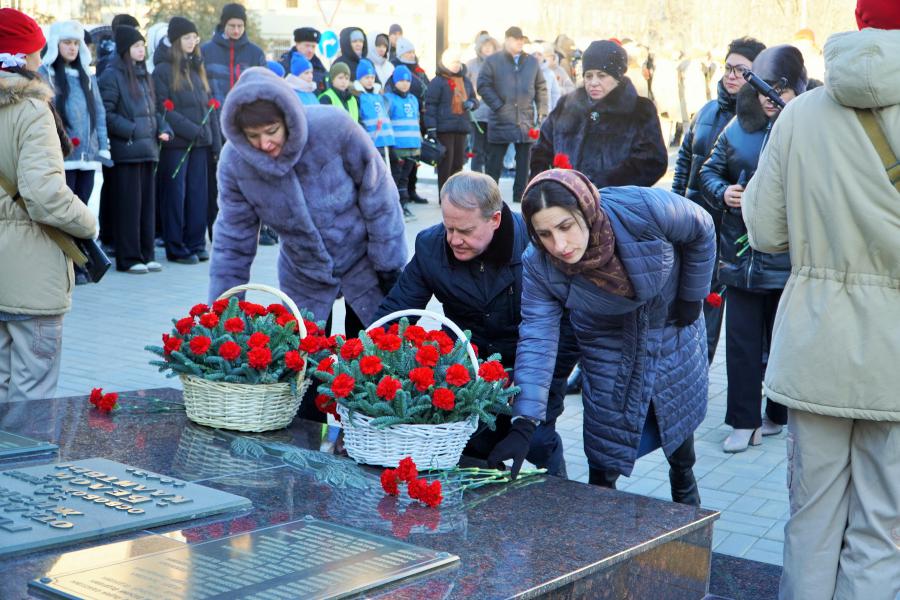 На Привокзальной площади собрались представители власти, ветеранских организаций и жители города. Они почтили память героев минутой молчания и возложили цветы к мемориалу павшим воинам.